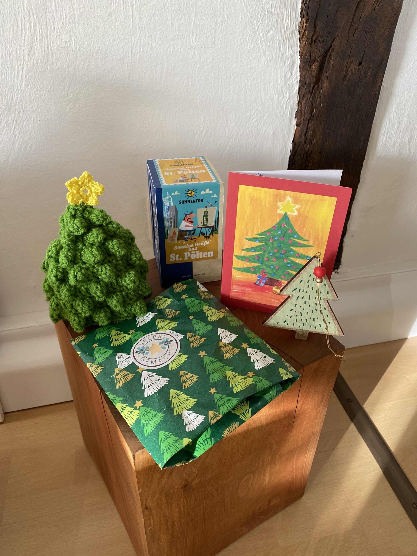 Der Weihnachtsbaum ist Thema deines liebevollen Geschenks. Geschenkpapier, Karte, Anhänger und schließlich der süße