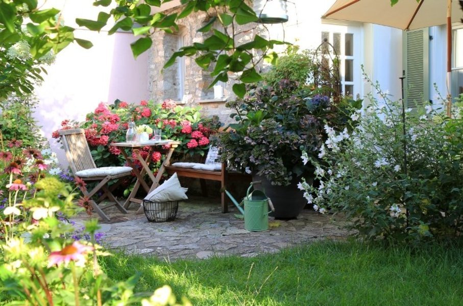 Wir nutzen unsere beiden kleinen Gärten sehr intensiv, denn hier schalten wir am besten ab. Trotz der geringen Größe haben wir viele verschiedene Plätze, die wir je nach Sonnenstand und aktueller Pflanzenblüte nutzen. Die Südterrasse zum frühstücken und wenn es noch nicht so heiß ist, das Gartenhäuschen für den frühen Morgentee, weil hier als erstes die Sonne herein scheint. Den Hofgarten nutzen wir zum Grillen oder an sehr heißen Tagen, weil es hier unter den Fliederbäumen immer etwas kühler ist. Und dann bestimmen natürlich auch die jeweiligen Blühphasen der Bäume und Stauden wo wir uns niederlassen. Wenn der Kirschbaum blüht oder an der Terrasse der Blumenhartriegel – wir nennen ihn unseren 1000-Sterne-Baum wegen der überaus üppigen und langen Blüte – genießen wir das immer sehr.