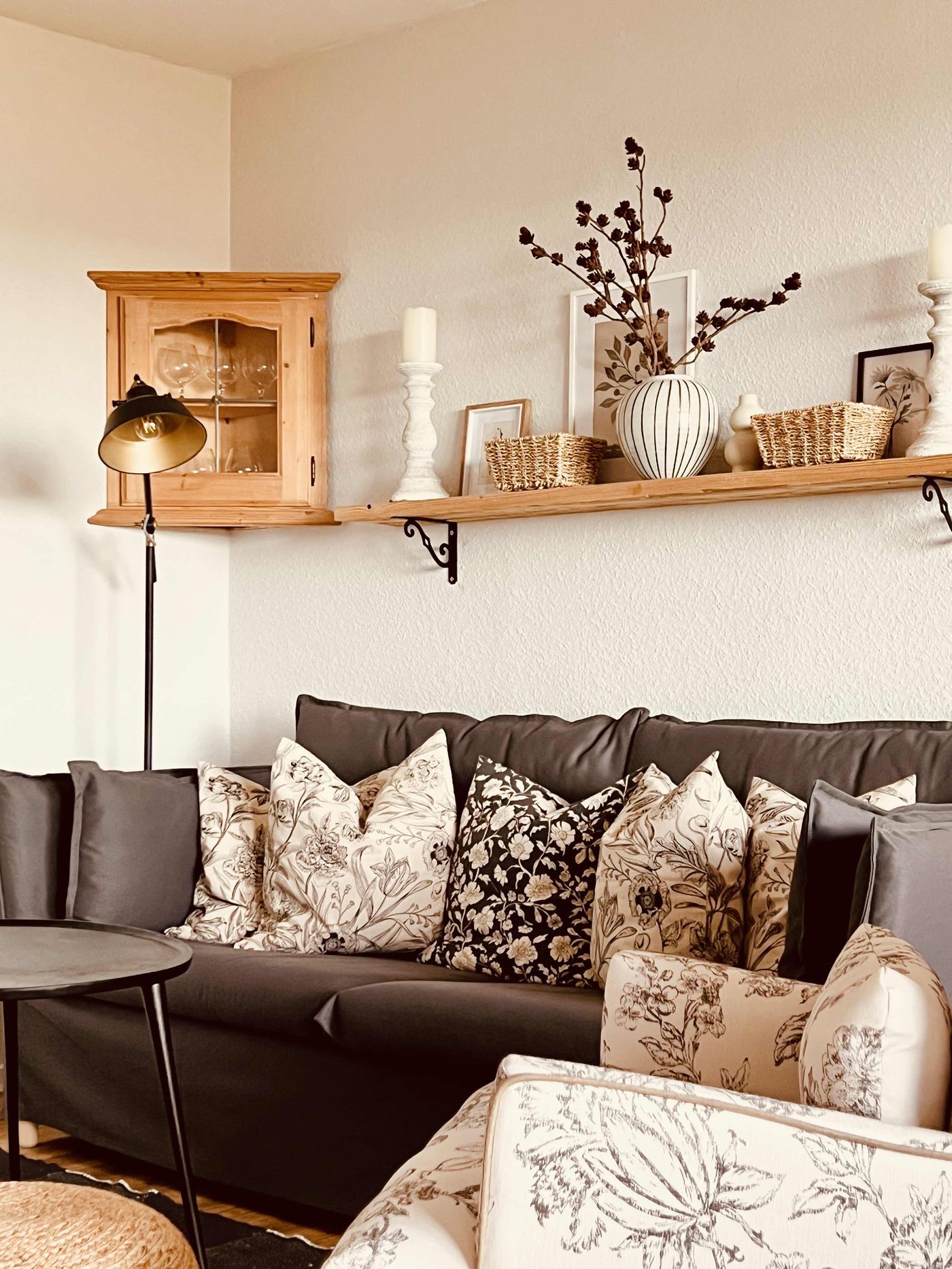 Landhaus meets Bohème: Auch Shabby- und Vintage-Elemente sind in kleinen Dosen eine interessante Dekoidee. Alte Holztruhen oder bestickte Kissen stehen im Kontrast zu schlichten Böden und Wänden und bringen ein wenig Spannung in dein Landhaus-Wohnzimmer.