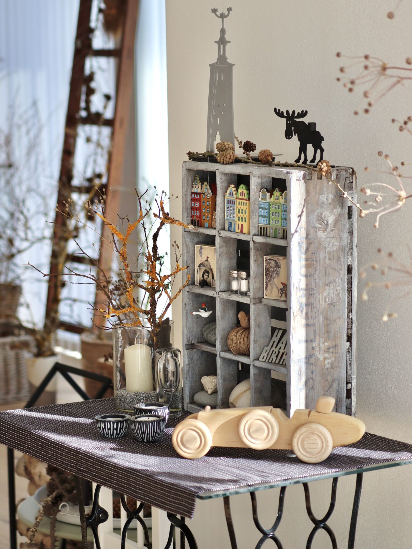 Blickt man aber in die Community, scheint der Setzkasten wieder „in“ zu sein. Mit Küchenutensilien, Vasen, Dalapferden und andere Figuren befüllt, wird er zum einzigartigen Dekoelement. Sogar Garnspulen können auf diese Weise schön präsentiert werden. Wenn man hingegen keine ausreichend große Sammlung hat oder Einzelobjekte hervorheben will, ist eher ein Glassturz das Richtige.