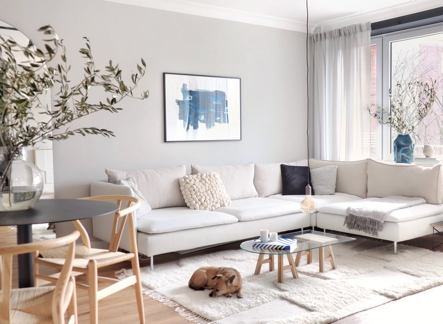 Die andere Seite des Wohnzimmers ist in Farrow & Balls „Cornforth White“ gestrichen und harmoniert wunderbar mit dem SÖDERHAMN-Sofa von IKEA. „Die eigentliche Hausherrin ist meine Hündin Ella (6), die fast schon zu perfekt mit der Einrichtung verschmilzt“, lacht Stefi.