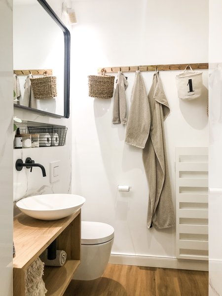 Der Spiegel in dem 3,75 qm kleinen Badezimmer ist von Maison du Monde, Deko und Handtücher sind von H&M Home.