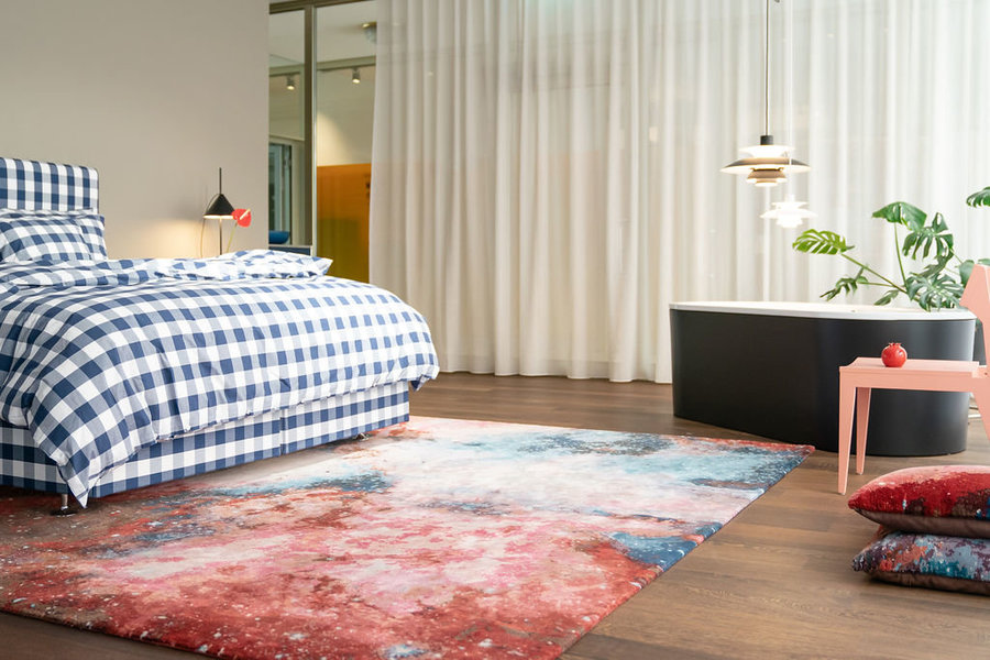 Herzstück des Schlafzimmers war das Bett eines schwedischen Luxus-Bettenherstellers: Bei dem Hästens-Bett durfte das ikonische Karomuster – ein Entwurf von 1978 – selbstverständlich nicht fehlen. Als würde das Bett im Universum schweben, diente ihm der Teppich „Space 1“ von Jan Kath als Bühne. Die frei stehende Badewanne Classic DUO OVAL ist mit ihrer schwarzen Ummantelung eine Neuheit von Kaldewei. Ebenso neu: die monochromen PH-5-Leuchten von Louis Poulsen.