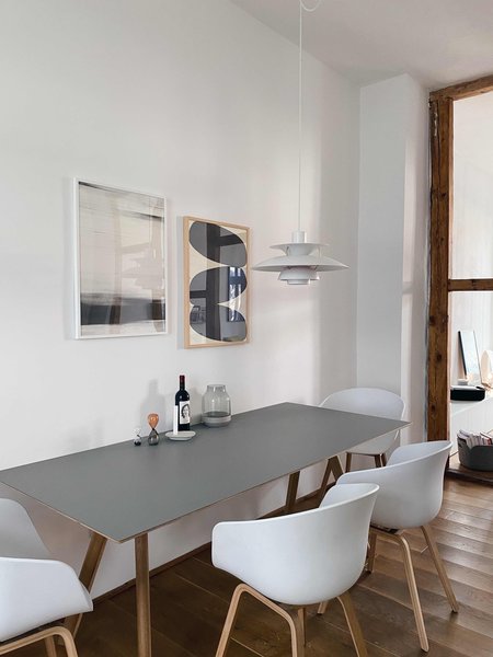 Die PH5-Leuchte von Louis Poulsen hängt jetzt über dem Esstisch, an den sich die Stühle About A Chair von HAY gesellen.