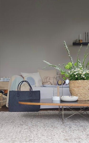Klassisch und gemütlich: Zum grauen Sofa von Kare Design hat Cathrin den Elliptical Table von Vitra kombiniert. Der weiche Teppich von Bolia sorgt für Gemütlichkeit, zarte Grünpflanzen sorgen für Frische. Ihre Textilien kauft Cathrin gerne bei H&M Home und Zara Home sowie bei OYOY und Design House Stockholm.