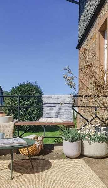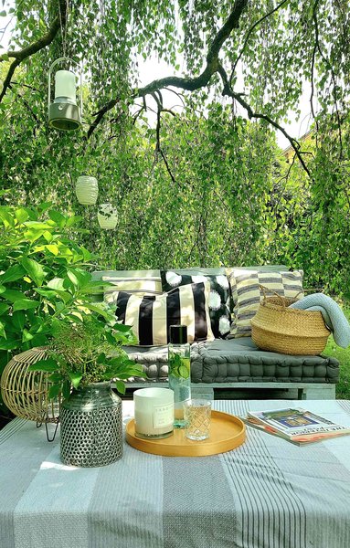 Der Platz unter der Birke ist Cathrins liebster Ort zum Entspannen. „Durch das Haus habe ich endlich einen halbwegs grünen Daumen bekommen (müssen)”, schmunzelt sie. „Früher hatten wir nur Kakteen. Bei dem Haus mit seinem Garten hieß es dann: Mach was draus oder gib dich mit Unkraut und Dornengestrüpp zufrieden!“ Ihre Loungemöbel aus Paletten sind selbst gebaut.