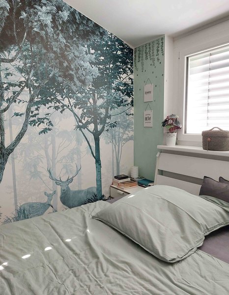 Natürliche Gemütlichkeit: Vor Kurzem hat Bettina im Schlafzimmer eine Tapete mit Waldprint angebracht. „Der Raum wirkt jetzt breiter als davor, was wohl dem 3-D-Effekt der Tapete zu verdanken ist“, vermutet sie. Ihre Bettwäsche und Textilien sind vornehmlich von H&M Home, Zara Home oder Bassetti.