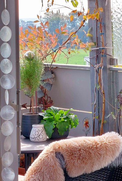„Den herrlichen Ausblick auf die Berge genieße ich beim Betreten des Wohnraums jeden Morgen aufs Neue!“, erzählt uns Bettina. Durch die Küche gelangt man auf den Balkon, der nach Osten hinausgeht. Bettina nennt ihn liebevoll „unseren Ausguck“.