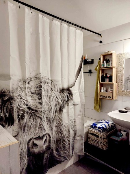 Der Duschvorhang mit dem strubbeligen Hochlandrind ist im Badezimmer ein echter Hingucker. Anstelle eines großen Kleiderschranks hat Bettina in ihrem Schlafzimmer verschieden hohe MALM-Kommoden von IKEA miteinander kombiniert.
