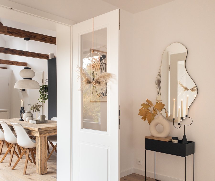 „Wir fühlen uns hier so wohl, als würden wir hier schon immer leben“, schwärmt Sarah (31) aka @haus_tannenkamp . 2019 hat sie mit ihrem Mann den Altbau von 1932 zwischen Oldenburg und der Nordsee gekauft und komplett saniert: Wände wurden herausgerissen, Zwischendecken entfernt und die alten Fenster durch große Fensterfronten ersetzt, die den Blick auf den eingewachsenen Garten und den dahinter liegenden Wald freigeben.