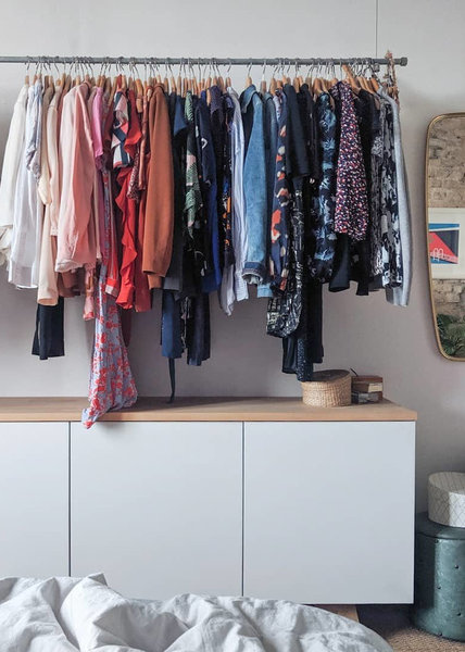 Als wir während unseres Studiums noch ein sehr knappes Budget hatten, haben wir viele Interior-Lösungen für Problemsituationen selbst umgesetzt. Wir haben einige Leuchten selbst gebaut, wie zum Beispiel die Kranleuchte im Wohnzimmer, die Holzleuchte über unserer Küchenzeile und die Rohrleuchte über der Kaffeemaschine. Auch unser offener Kleiderschrank – eine Kombination aus Sideboard und Kleiderstangenkonstruktion aus Sanitärrohr – ist noch für unsere erste gemeinsame Wohnung von uns konzipiert worden.