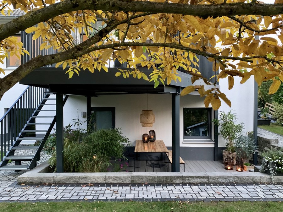 Die geschützte Terrasse unter dem Balkon ist der ideale Ort für Gartenfeste.