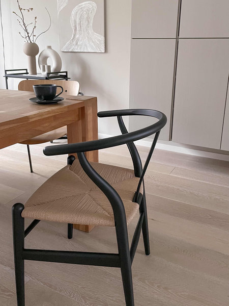 Anna arbeitet sich immer weiter zum gewünschten Stuhlmix am Esstisch vor. Der lang ersehnte Wishbone Chair in Schwarz durfte erst vor Kurzem einziehen. Nun steht der schwarze 210 R von Thonet ganz weit oben auf Annas Wunschliste.