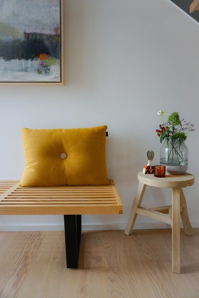 Das Kissen von HAY ziert die Bank von Georg Nelson. Die Vase von Muuto auf dem Offcut-Hocker von Tom Dixon ist in bester Gesellschaft von der Wooden Doll No. 17 von Vitra