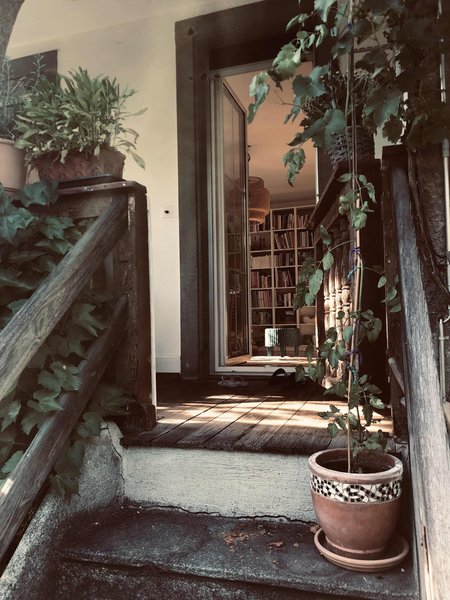 Im Frühling und Sommer umrahmen grüne Sträucher den Balkon und die Treppe, die in den Garten führt.