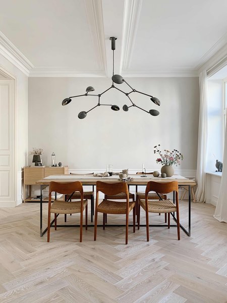 Für etwas Stauraum sorgt das Sceene bookcase aus Eiche von Gejst Design. Izabellas Traumleuchte – der Drop Chandelier von 101 Copenhagen – ist erst vor Kurzem bei ihr eingezogen.