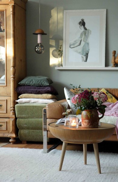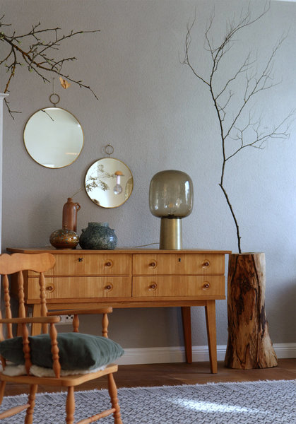 Bei Farben bevorzugt Katharina gedeckte, natürliche Töne. Als kleine Farbtupfer dienen im Wohnzimmer Kissen, Decken und Vasen – bevorzugt in Gelb, Grün und Rosa. Bezüglich Materialien fällt ihre Wahl meistens auf (Alt-)Holz, Schurwolle, Leinen und grobe Keramik. Katharina mag es, wenn Gegenstände eine ansprechende Haptik haben. Für etwas Glanz sorgen in kleinen Portionen Elemente aus Messing.