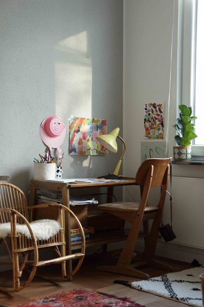 Malecke im Wohnzimmer und ein DIY-Hocker aus einem Baumstamm im Kinderzimmer ihrer Tochter.