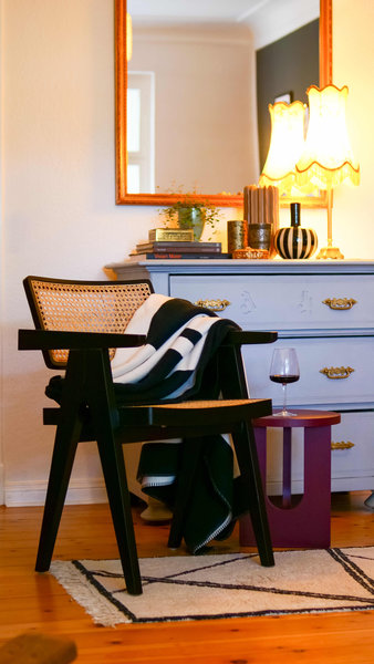Nicoles Lieblingsplatz im Wohnzimmer. Die Flügeltür führt theoretisch zum Schlafzimmer, wurde aber zugunsten der Stellfläche eines Kleiderschranks auf der anderen Seite verschlossen. Den schwarz-weiß gemusterten Leuchtenschirm hat Nicole über Etsy gekauft. Von der Farbe des dunkelroten Beistelltisches war Nicole zunächst gar nicht begeistert, ist mittlerweile aber großer Fan davon. Zudem matcht er wunderbar mit dem farbenfrohen Teppich.
