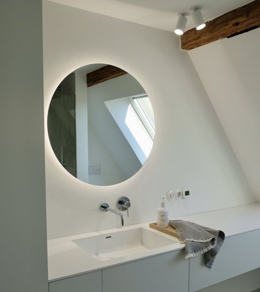 Bis das Badezimmer so aussah, war es ein langer Weg. Lediglich das Fenster ist geblieben. Der Waschtisch LITHO von VALLONE integriert sich zurückhaltend in das auch ansonsten schlicht gehaltene Bad. Schwarze Details sorgen für Akzente.