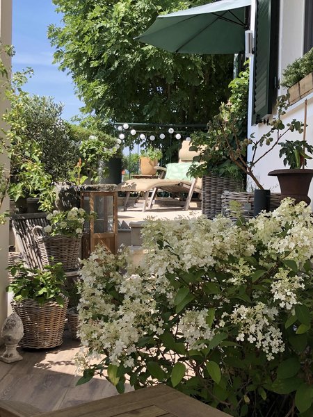 „Ich liebe die Arbeit in meinem Garten! Aber noch mehr liebe ich es, wenn ich entspannt auf der Terrasse sitze und alles mit einem Drink genießen kann“, lacht Tina (47) aka @tinas_homeandgarden . „Ich möchte nicht mit stundenlanger Arbeit auf Trab gehalten werden – beziehungsweise nur dann, wenn ich das auch wirklich will!“ Der kleine Garten wurde von Tina in Eigenregie komplett neu angelegt, da sich kein Gärtner darum kümmern wollte. Heute ist Tina sehr dankbar darüber, dass es so gelaufen ist, denn nur so konnte sie ihr Konzept und ihre Ideen ganz genau umsetzen.