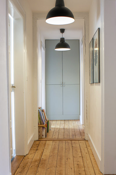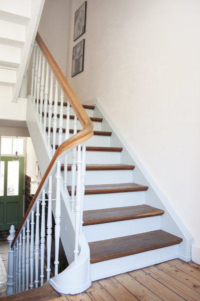 Den Schrank (rechts) hat die Familie mit dem Haus mitgekauft. Frisch gestrichen und in luftigem Grau passt er jetzt prima auf halber Treppe.