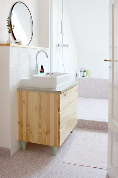 Der Waschtisch im Bad ist ein IKEA-DIY. „Es macht mir Spaß, aus IKEA-Stücken etwas Neues zu machen. Der Waschtisch ist ein richtiger Blickfang, auf den wir bei jeder Hausführung angesprochen werden“, sagt Kathrin. Die Garderobe ist ebenfalls ein DIY.