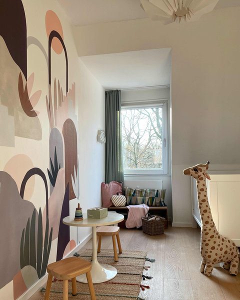 Im Gegensatz zu den zurückhaltenden Farben im Rest der Wohnung durfte im Kinderzimmer eine bunte Tapete einziehen. Dazu kombiniert Susanne einen kleinen Tisch, der wie die Miniaturversion des Saarinen-Esstischs aussieht.