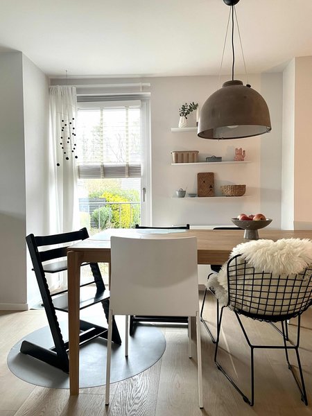 „Die Wohnung ist Teil eines Dreifamilienhauses und gestaltet sich wie ein Reihenendhaus über mehrere Etagen“, erklärt Susanne alias @Suse1182 . Ihre 125 qm große Eigentumswohnung liegt im Hamburger Norden, nur wenige Straßen zur Grenze nach Schleswig-Holstein entfernt. Seit 2020 lebt die 40-Jährige dort mit ihrem Mann und den beiden Kindern. Drei Monate lang haben sie 70er-Jahre-Raufasertapeten und -Teppichböden entfernt und die Wohnung in ein gemütliches Familienzuhause in gedeckten Farben und hellen Holztönen verwandelt.