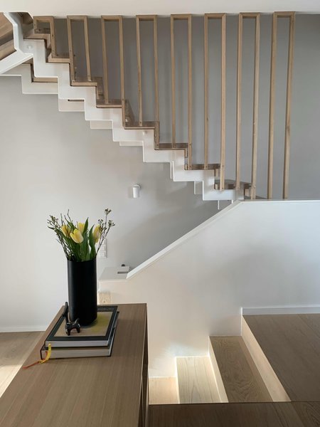 Stimmt! Als ich das erste Mal in die Wohnung kam, war mein einziger Gedanke, wie wir diese Treppe optisch in den Griff kriegen können. Tatsächlich sind wir erst kurz vor Einzug und nach mehreren Entwürfen auf die Idee mit den Winkelstufen und den Holzlamellen gekommen. Mein Mann hat die Absturzsicherung dann selbst gebaut. Nun empfinde ich die Treppe eher als Eyecatcher und bin sehr froh über unsere Lösung.