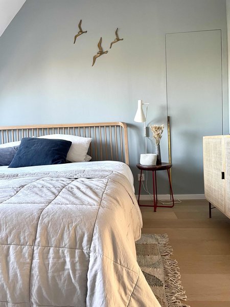 Susanne arbeitet seit einigen Jahren als Architektin in der Projektsteuerung im Bereich Wohnungsbau, plant aber nicht mehr selbst. „Die Kreativität im Job fehlt mir manchmal, aber ich bin ein totaler Organisationsmensch und mag sehr an meiner Position, dass bei mir die Fäden zusammenlaufen.“ Das Bett ist von Ethnicraft, die Nachttischleuchten sind von Bolia.