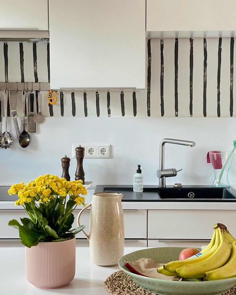 „Die Küche würde ich heute anders planen, nämlich ohne Tresen und in L-Form“, überlegt Katha. „Allerdings wüsste ich dann nicht, wohin mit all den Sachen.“ Die Küche selbst stammt von Nolte, der Teppich von IKEA. An der Wand durften ein paar dunkle Streifen einziehen: „Weiß fand ich einfach zu langweilig!“