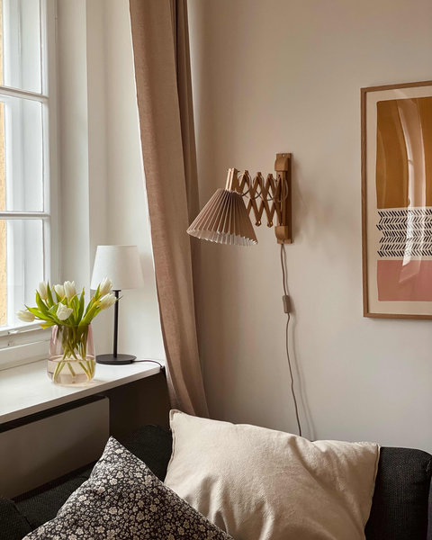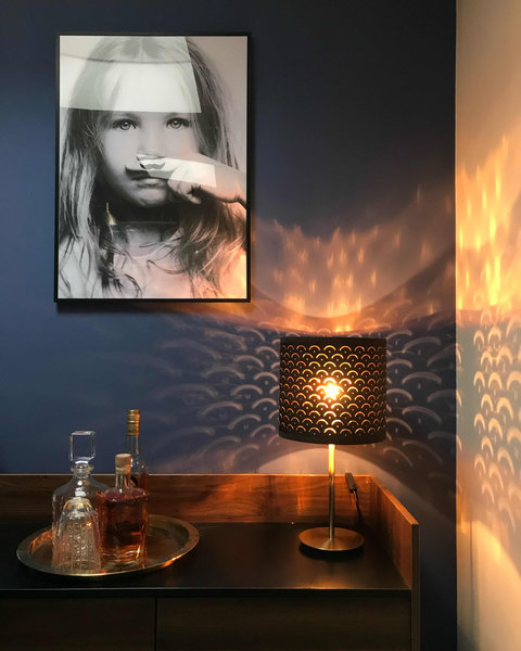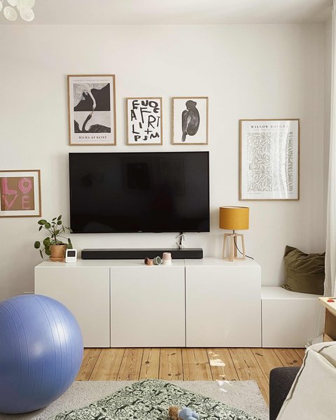 An der Wand im Arbeitszimmer hängt ein Foto von der „coolsten Socke überhaupt“, wie Katha ihre Tochter nennt. Im Wohnzimmer fügen sich eine stimmungsvolle Bilderwand, ein TV-Schrank von IKEA sowie der Wollteppich von Otto Landshut zu einem gemütlichen Ensemble. Die kleine Tischleuchte ist von Maisons du Monde. Ihre Kissen kauft Katha gerne bei IKEA oder H&M Home.