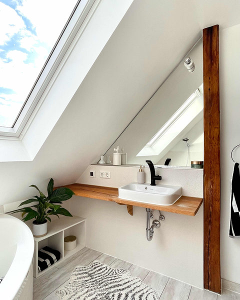 Im Haus gibt es insgesamt drei Badezimmer, die alle eher klein ausfallen. Das Bad unter der Dachschräge wirkt mit monochromen Textilien und warmem Holz gemütlich und elegant. Im Schlafzimmer, ebenfalls im Dachgeschoss, sorgt ein Schrank aus der IDANÄS-Kollektion von IKEA für Ordnung.