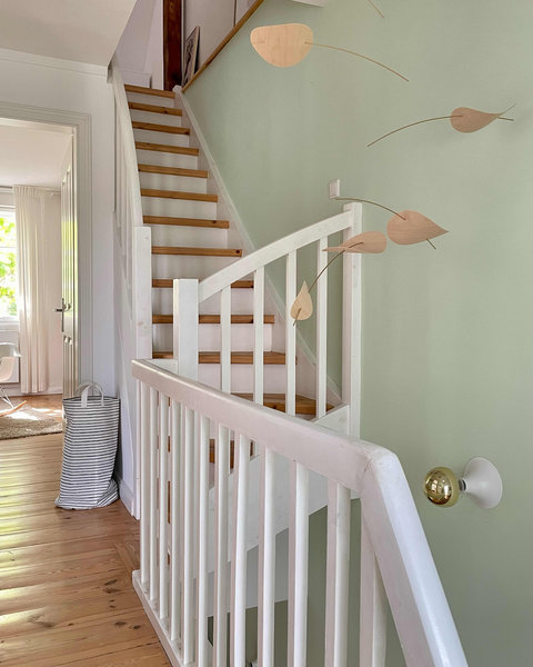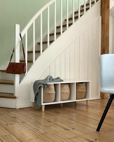 „Mit unseren Dielen ist es eine Hassliebe“, gesteht Katha. „Sie sind wunderschön, aber auch super nervig, weil irgendwie immer alles schief steht!“ Die wundervolle alte Treppe hat sie mit einer Bank aus eBay Kleinanzeigen und einem Mobile von Flensted kombiniert. Die Wandfarbe ist von Schöner Wohnen.