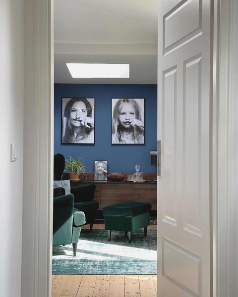 Zwar gibt es im Haus nicht so viele farbige Wände, im Arbeitszimmer jedoch trifft ein kräftiges Blau auf dunkles Holz und grüne Loungesessel. Letztere hat Katha bei IKEA ausgesucht, das Sideboard ist von JYSK. Die Bilder an der Wand sind ein Geschenk von Katha an ihren Mann.