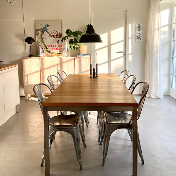Stimmiges Ensemble: Den Esstisch von Bolia umringen Tolix-Stühle, über ihm hängt eine Werkstattleuchte. In der Küche gesellen sich Kaiser-Idell-Scherenleuchten an der Wand zu Leuchten vom Flohmarkt über der Kücheninsel.