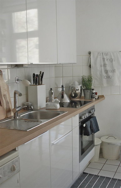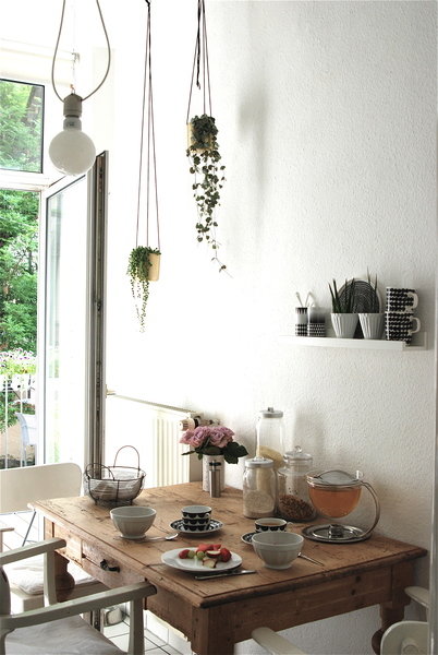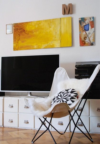 Durch die Nord-Ost-Ausrichtung der Wohnung haben wir recht wenig Licht. Somit ist es mir eine helle Einrichtung wichtig und dass die Räume nicht zu vollgestellt erscheinen. Außerdem ist in der Wohnung ein dunkler, vom Leben gezeichneter Fischgrätparkett verlegt. Dieser ist zwar schön, trägt aber nicht unbedingt zu einem hellen Erscheinungsbild bei. Die Einrichtung der Wohnung erfolgte erst nach und nach. Einige betagte Möbel, zum Beispiel eine Kommode von meinem Ex-Freund, die alten Möbel aus der Arztpraxis meines Opas, sowie der Küchentisch aus WG-Zeiten waren von Anfang an vorhanden. Als mein Freund mit in die Wohnung zog, gab es eine Zeitlang ein Zimmer mit dem Inventar seines ehemaligen Jugendzimmers. Glücklicherweise wurde aus diesem „Grauen Salon“ schon bald ein Arbeitszimmer mit weißen Regalen und Schiebetüren. Die Küche haben wir 2013 nach unserer Elternzeit in Thailand austauschen lassen. Inzwischen gibt es definitiv keinen Platz – und keine Notwendigkeit – mehr für neue Möbel. Schade eigentlich! Es müsste das ein oder andere Stück weichen, um Platz zu schaffen.