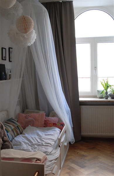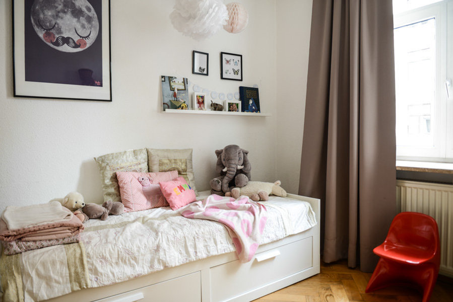 So glücklich ich auch über das helle Arbeitszimmer war, so war es der einzige Raum in der Wohnung, der noch Spielraum für ein Kinderzimmer bot. Da die Massen an Arbeitsmaterialien für meinen Beruf aber leider auch irgendwo hinmüssen und besagter Flur einfach keine Stauraumschränke verträgt, ließen wir das Zimmer mit einer Trockenbauwand teilen. Der vordere Teil mit Fenster ist nun Kinderzimmer. Der hintere, dunkle Teil mein Arbeitsbereich. Eine Schiebetür verbindet beide Räume. Aktuell ist dies eine gute Lösung. Wenn Madame dann zum Teenie wird, müssen wir mal schauen. Wie aber bereits Labelfrei treffend feststellte, verhindert die angespannte Wohnungsmarktsituation in München einen Umzug. So müssen wir einfach weiter kreativ mit dem vorhandenen Platz umgehen.