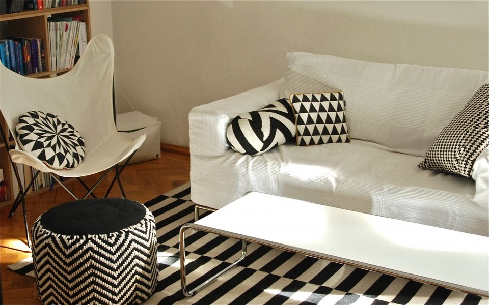 Da bin ich ein wenig eingeschränkt. Zuviel Farbe macht mich unruhig. Ich halte es beispielsweise nie lange aus, eine farbige Tischdecke anzuschauen. Auch wenn mir einmal eine Schülerin mitgeteilt hat, dass ich nicht immer Schwarz, Weiß oder Grau tragen solle, da Kinder bunte Farben lieben würden. Diese Farbpalette findet sich auch in den Textilien unserer Wohnung wieder. Neben dem Holz der alten Möbel gefallen mir die ehemaligen Arztschränke aus Metall sehr. Grafische Muster mag ich ebenso wie die natürlichen Strukturen von Fellen und Wolle.
