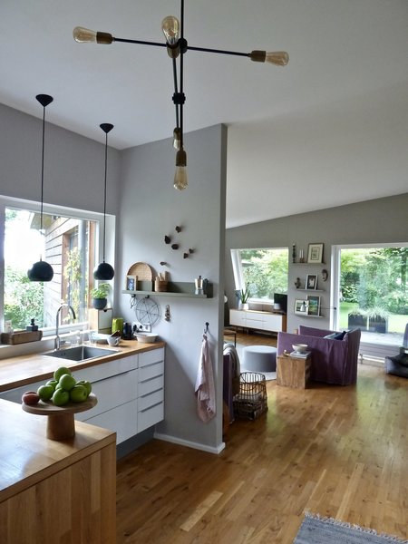 Der große Wohnraum ist das Herzstück des Bungalows. Mittlerweile stören Patricia der Essensdunst und die Geräusche, weshalb eine Abtrennung im Industriestil aus schwarzem Stahl und Glas zwischen Küche und Wohnbereich auf ihrer Wunschliste ganz oben steht. Die runden Leuchten über der IKEA-Küche sind von Bolia, die Molecular-Deckenleuchte ist von House Doctor.