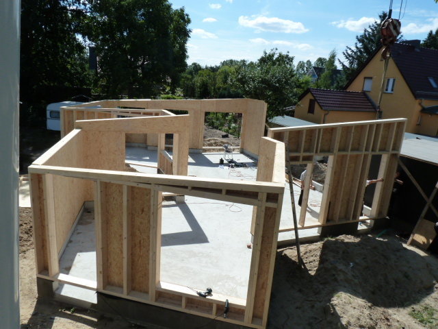 Der Bungalow ist als Holzständerwerk konzipiert. „Das ist ökologisch mehr als sinnvoll – geringer Fußabdruck und frisst auch als fertiges Haus Umweltgifte“, erklärt Patricia. Innerhalb eines Tages wurden die einzelnen Wände mit Kränen von Lkws geladen und auf der Bodenplatte verankert.