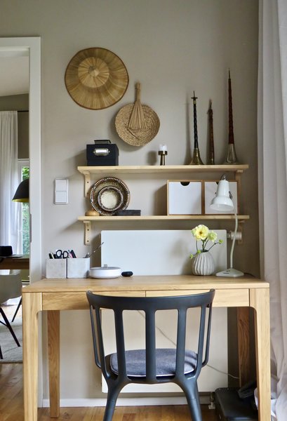 Vom Essbereich gelangt man in einen kleinen Raum, der als Arbeits-, Musik- und Gästezimmer dient. Vor einem Home24-Schreibtisch steht der PS-Stuhl von IKEA. Hier befindet sich auch der Ghost-Sessel von Gervasoni, der zu entspannten Lesestunden einlädt – Morgensonne inklusive.