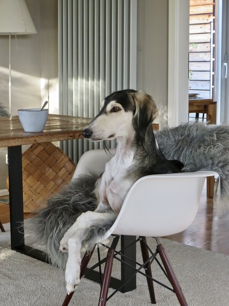 Windhund Barough nutzt gerne Patricias morgendlichen Kaffeeplatz, sobald sie ihn verlassen hat. Im dahinter liegenden Raum befindet sich das Klavier von Patricias Mann, der Musiker ist. „Für mich ein absolutes Zuhausegefühl, wenn er dort spielt“, schwärmt Patricia.
