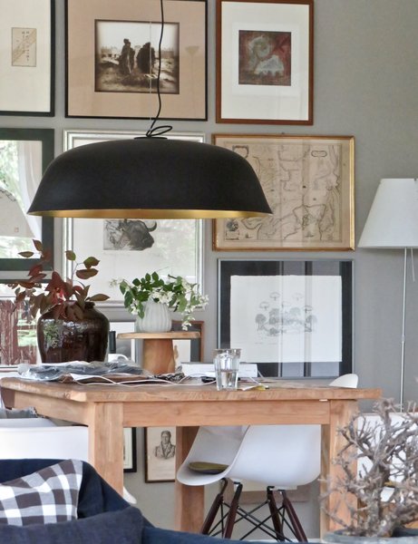 Den Esstisch haben Patricia und ihr Mann vor langer Zeit auf einer Indienreise entdeckt und nach Deutschland verschiffen lassen. „Er hat eine wunderbare alte Platte aus abgewetzten Bodendielen, auf denen Handwerker ihre Spuren hinterlassen haben“, schwärmt Patricia. Vor Kurzem hat Patricia das Untergestell durch Metallkufen von Natural Goods ausgetauscht. Die Cloche-Pendelleuchte ist von Norr11.