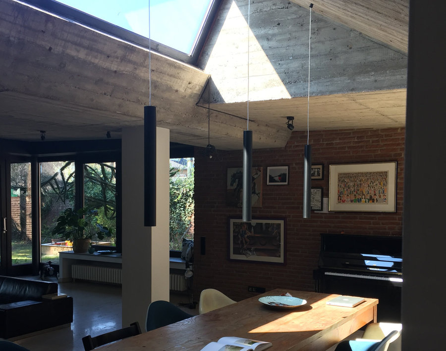 Wir planen den Umbau eines eingeschossigen Anbaus, der gerade als Schuppen genutzt wird und der zum Gästebereich mit eigenem Eingang und Bad werden soll. Außerdem wollen wir ein ehemaliges Schwimmbad im Untergeschoss zu einem Atelier und Multifunktionsraum ausbauen. Hier profitieren wir gestalterisch von der Deckenhöhe, die sich durch die Tiefe des Beckens ergibt. Wir werden dieses Jahr beginnen, die Konstruktion freizulegen, sodass auch hier die Sichtbetondecke zum gestalterischen Element wird.