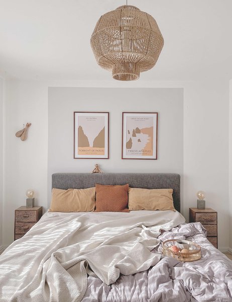 Drei PAX-Schränke von IKEA sorgen im Schlafzimmer für genügend Stauraum. Der Holzstuhl davor ist ein Erbstück von Sues Opa, die Magazinhalter an der Wand dahinter sind ein DIY. Die Hängeleuchte sowie die beiden Nachttische neben dem Boxspringbett sind von Maisons du Monde. Selbst gestaltete Bilder sowie Kissen von IKEA und H&M Home sorgen für Farbakzente.
