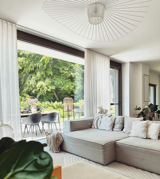 Es war Liebe auf den ersten Blick! Durch die großen, bodentiefen Fenster mit Blick in den Wald hatte ich direkt ein unglaublich freies Gefühl. Und dieses hält bis heute an: Für mich ist unser Zuhause ein Ort, an dem ich durchatmen kann.