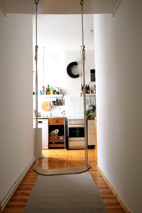 Mithilfe von Regalbrettern kann in hohen Altbaufluren neuer Stauraum geschaffen werden: Die Bretter werden an den beiden Seitenwänden befestigt. Je nach Deckenhöhe können ein oder mehrere Regalbretter eingezogen werden. Lange, helle Läufer strecken den Flur optisch und machen ihn wohnlicher. Eine Schaukel kann als verspielter Zusatz für Kinder montiert werden.