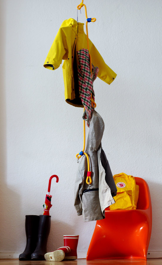 Für einen Farbtupfer in Flur lässt sich ganz einfach eine Garderobe aus zwei bunten Seilen selber machen: Das dicke Seil dient als Garderobenbasis, mit dem dünneren Seil werden die Schlaufen gebunden. Zur genaueren Anleitung von Mitglied MiMa9308 geht's hier. Eine weitere einfache DIY-Idee: Zwei Holzstangen (die in beliebiger Farbe lackiert werden können) am Ende des Flurs an der Wand befestigen und Haken oder Kleiderbügel dranhängen.